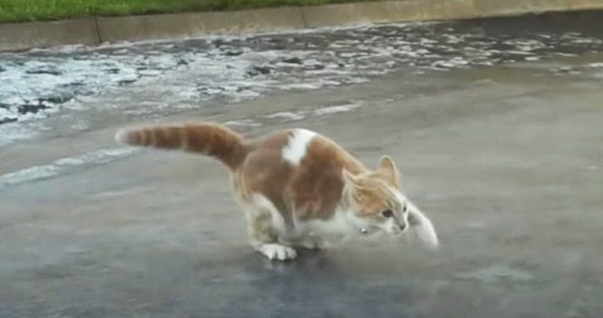 Hon tittade ner på marken och kände förmodligen att det inte riktigt var som det skulle. Det blir halt på vintern även för en lätt och nätt katt. Ägaren skriver i en kommentar till Youtube-klippet att isen var ny den dagen och att katten upptäcker hur kul man kan ha på densamma!