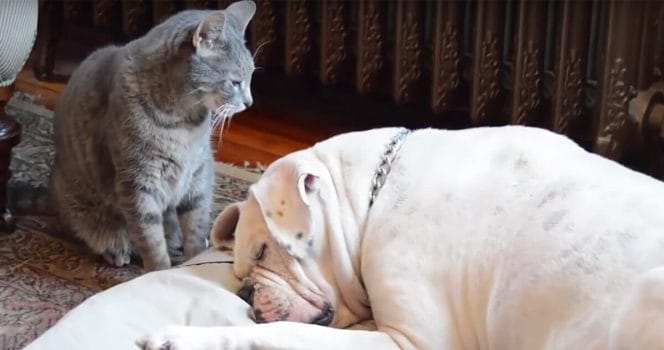 När inte det fungerar bestämmer sig katten för att istället gå på ett något mysigare spår. Hon stryker sig mot hundens huvud – men tror du hunden rör på sig?