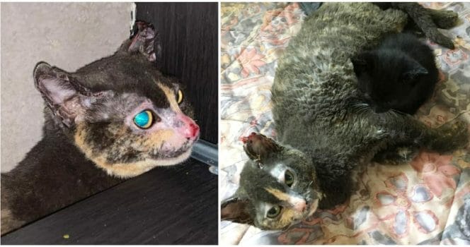 Kattmamman trotsade elden och sprang upprepade gånger tillbaka in i ladan, riskerade sitt eget liv och fick allvarliga skador: hon fick svåra brännskador på mage, tassar och öron.