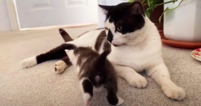 Det görs flera försök men varje gång kattungarna ska närma sig Tommy väljer han att lägga benen på ryggen! Kattägaren förklarar i en kommentar till videon: