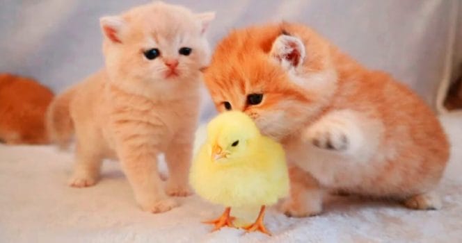 Det är Youtube-kontot Teddy Kittens som ligger bakom den stora succén. I filmen får vi se hur två urgulliga små kattungar reagerar när de får möta den ännu mindre kycklingen.