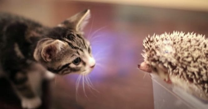 Youtube-användaren ”TheSorryGirls” förklarar att igelkotten heter Harley och kattungen Loki. De blir vänner och det är så fint att se den gemensamma respekt de visar varandra.