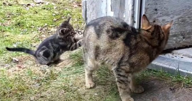Efter ett tag tröttnade kattmamman på ungens busiga agerande bakom hennes rygg. Hon vände sig då om och bestämde sig för att ge henne en liten ”bestraffning”.