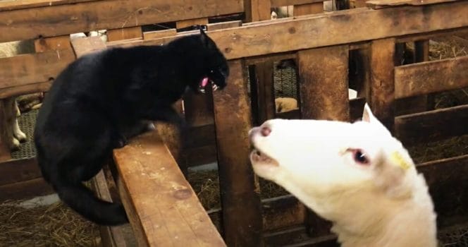 I klippet kan man se hur katten vandrar runt, runt alla fåren – och när ett får till slut närmar sig katten en aning, svarar han med att ”slå” till fåret på nosen ett par gånger.