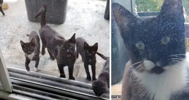 Den som knackade på fönsterrutan var den här katten. Hon hade tidigare under dagen varit hos Kurtis och Melanie och fått sig ett litet skrovmål. Nu, en stund senare, var hon alltså tillbaka – och hon hade sällskap av inte mindre än fyra andra, små katter, skriver Love Meow.
