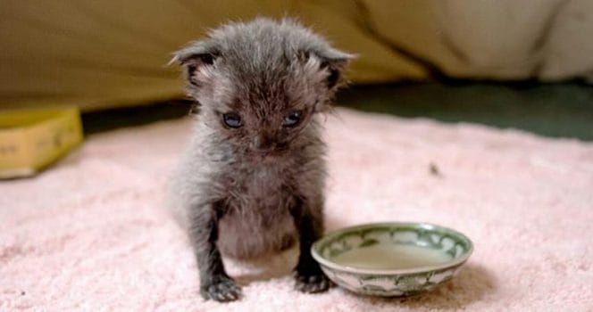 Han var så liten när han kom till Kathyn. Här får han dricka mjölk ut en liten spruta. I början fick han ligga i en varm filt och fick mat på flaska hela tiden.