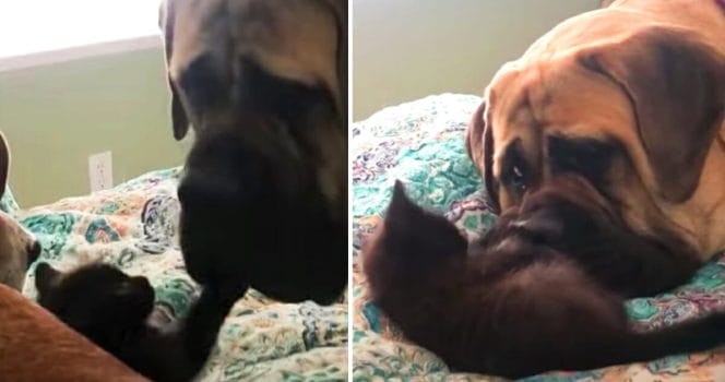 När den här nyfikna lilla kattungen viftar med sin tass framför ögonen på hunden reagerar han så himla fint. Det här klippet kommer värma hjärtat och förhoppningsvis göra er dag lite lättare i dessa pandemitider.