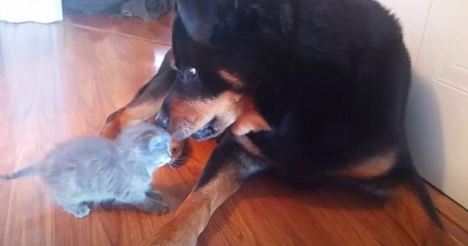 Det tog verkligen den här fina rottweilern tillvara på när han för några år sedan för första gången fick träffa sin nya fyrfotade kompis i familjen. Kattungen fick namnet Akula – och hunden i klippet heter Choko.