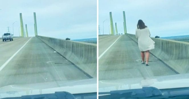 Liten varelse svävar i fara på broräcket – då kliver en kvinna ur bilen och går närmare