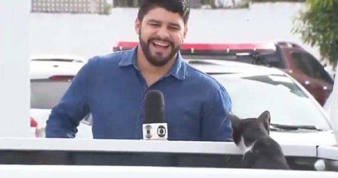 Tv-reportern Artur Lira från Brasilien gör sig här redo för att tala in i kameran när han plötsligt störs av den lilla katten som stryker sig längs hans ben. Enligt Globo är katten herrelös men brukar få mat på den lokala polisstationen när den tittar förbi.