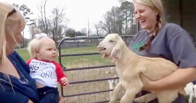 Den här lilla tjejen i videon nedan fick följa med i mammas famn och hälsa på en get. Nästan omgående börjar de prata med varandra, eller snarare imitera varandra, och visst är geten minst lika pratglad som bebisen.