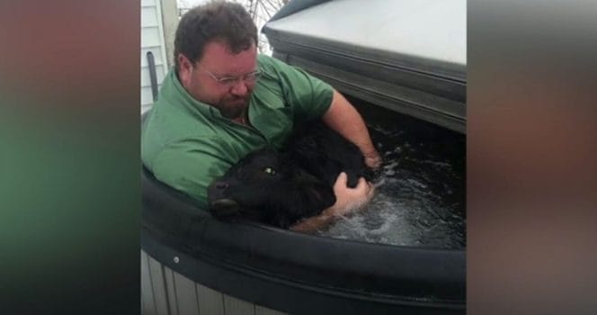 Utanför ytterdörren på hans hus fanns lösningen – en varm och skön pool. Så Dean lade sig i poolen tillsammans med kalven, för att värma upp honom.