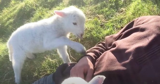 Det lilla urgulliga lammet kliver fram till en man som ligger ner i gräset och njuter av solen. Lammungen petar försiktigt på honom med sin lilla klöv. Detta som om hon vill ha hans uppmärksamhet. Det här är ingen blyg liten vän, utan ett socialt lamm som vill ha värme och kärlek.
