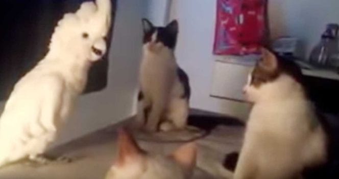 Den här kakaduan bor tillsammans med tre katter och har hört dem prata med varandra länge. Så länge att han lärt sig prata tillbaka med dem.