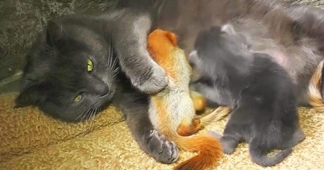 Titta nu i videospelaren nedan där Pusha tar hand om sina kattungar och ekorrbebisar – sida vid sida. Och spinner nöjt som den utmärkta mamman hon är!
