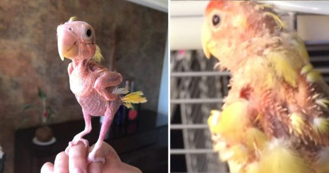 Dvärgpapegojan Blondie var, som alla andra fåglar, naken som nyfödd. När han flyttade till familjen Escobar i Venezuela och började växa blev han en ståtlig figur med väldigt färgstarka fjädrar.