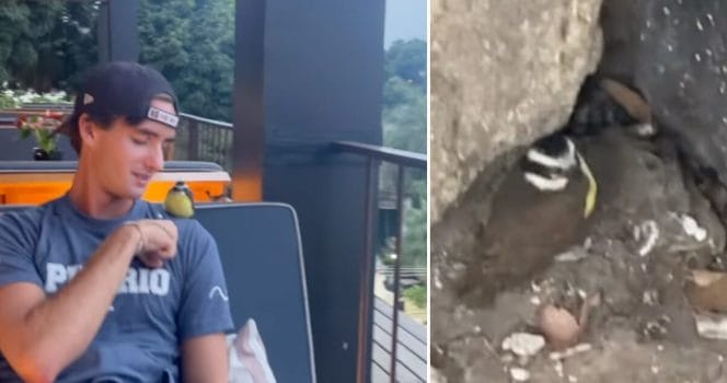 I klippet, som har fått över 1 miljon gilla-markeringar, visar han upp när han hittar en övergiven liten fågel som har krypit ihop i ett hörn på gatan i Rio de Janeiro.