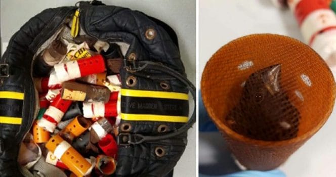 På något vis hade den här mannen lyckats smuggla med sig hela 34 stycken små fåglar i dessa plastbehållare som han tejpat runt. De stackars små fåglarna var helt instängda i de minimala papiljotterna i väskan. Det måste ha varit outhärdligt att ha rest i den värmen, med dålig luft i väskan, och dessutom på minimal yta.