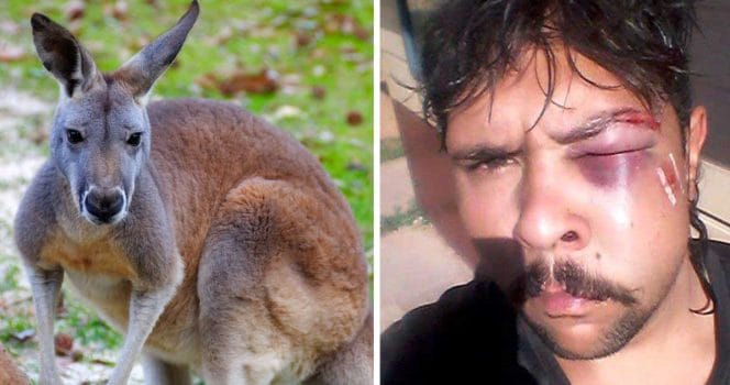 Det var när han lutade sig ut från sin bil för att skita på två kängurur som en tredje plötsligt hoppade på honom och skallade honom i ansiktet.