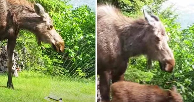 Den här älgmamman har nämligen sällskap av sina två älgkalvar. Och de kan inte sluta leka med vattnet när de kommer in i trädgården!