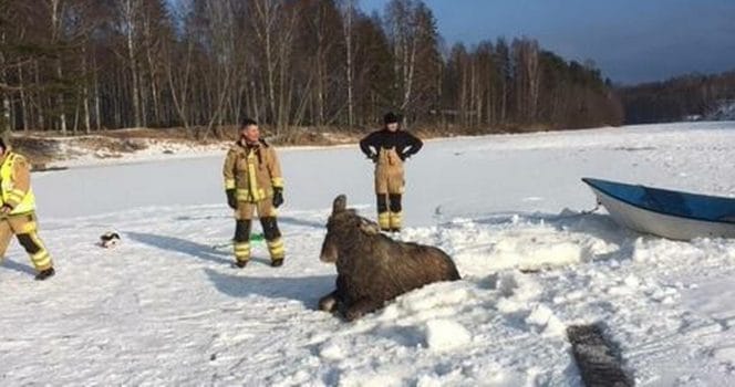 Älgen ska ha blivit slö av kylan, men tillsammans lyckades de dra upp den på iskanten. Dock var den fortfarande väldigt slut efter händelsen.