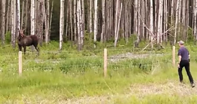 Vilken tur för kalven att rätt person dök upp på rätt plats. Älgar kan vara aggressiva – i synnerhet när de har kalvar. Så det var mycket modigt av mannen att göra detta.