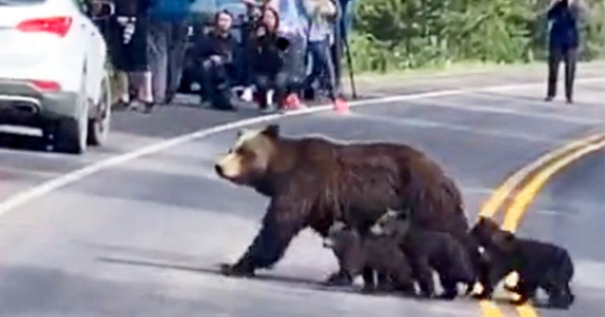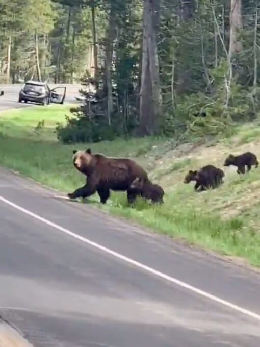 Det var en helt vanlig dag i delstaten Wyoming i USA sommaren 2020 som en björnfamilj fångades på bild när de skulle passera vägen.