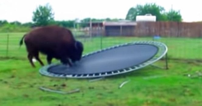 Det är på Youtube-kanalen Buffalowhisperer som man kan se det härliga klippet på när det stora djuret försöker sig på att hoppa studsmatta.
