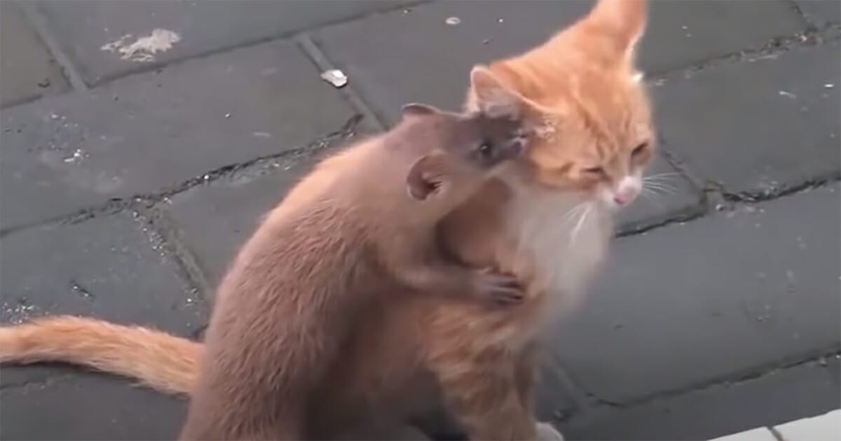 Katten ser förvisso ut att tycka den lilla kompisen är lite intensiv, men låter ändå vesslan leka för fullt. De busar och skojar – och kramas och pussas!