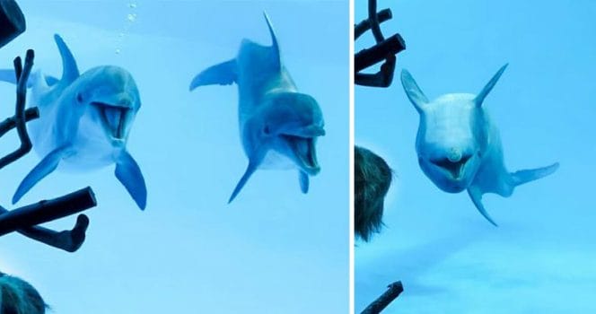 Just nu cirkulerar bilder på ett gäng delfiner vid Texas State Aquarium, som blir eld och lågor över något – eller snarare någon, de ser.