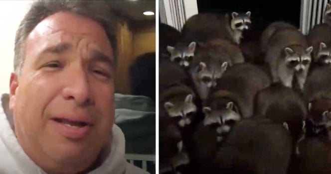 Vilda tvättbjörnar kan bli så vara vid människor att de blir tama. Och så blev det även i det här fallet. Efter ett tag började mannens tama tvättbjörn ta med sig några kompisar för att få mat varje kväll.