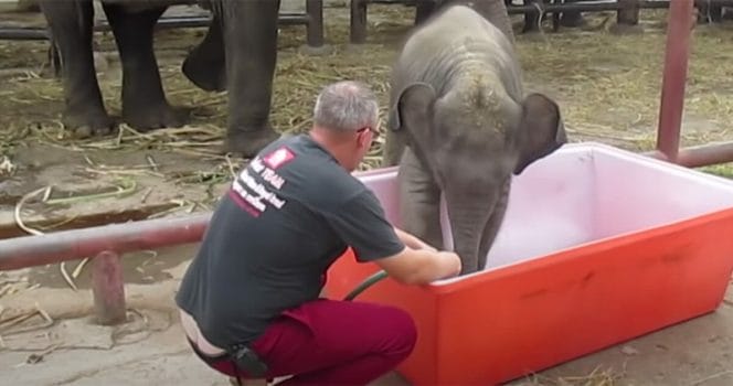 I en video på Youtube som har setts över 18 miljoner gånger får man se hur elefanskötaren ställt fram en liten orange pool för elefantungen att bada i.