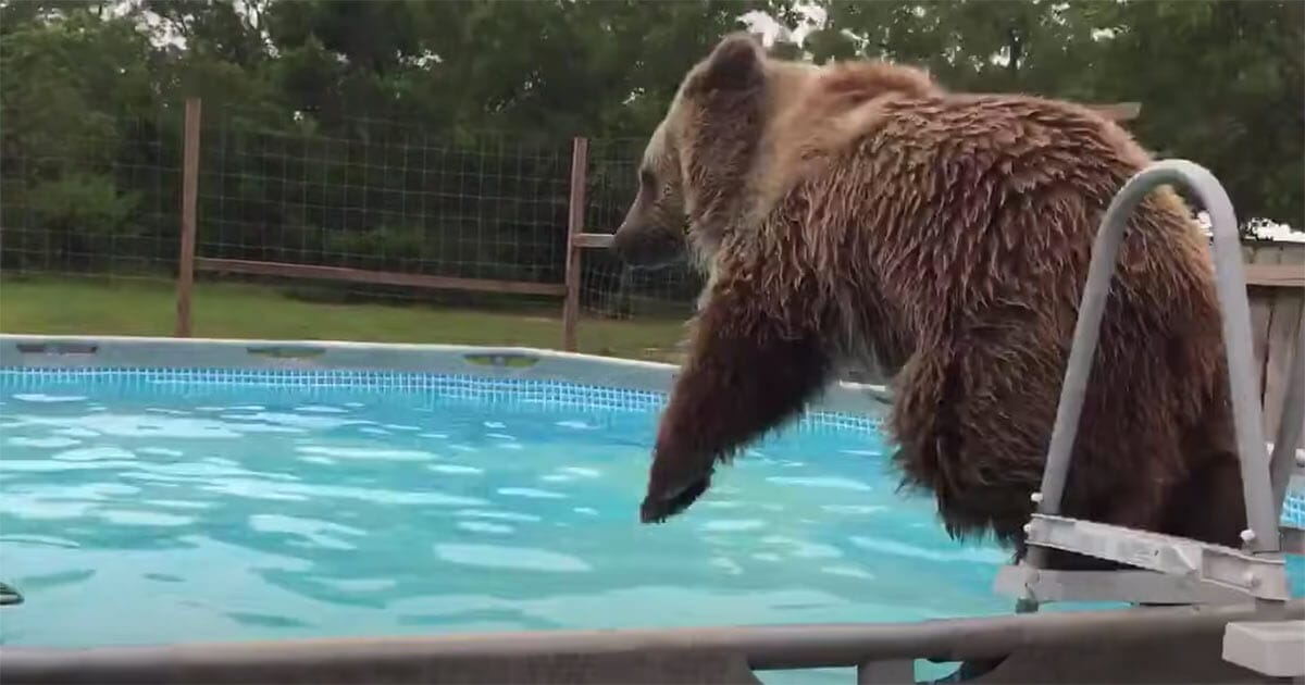 I videon syns hur den stora björnen gör ett riktigt magplask i poolen och leenden när han är klar vet inga gränser.