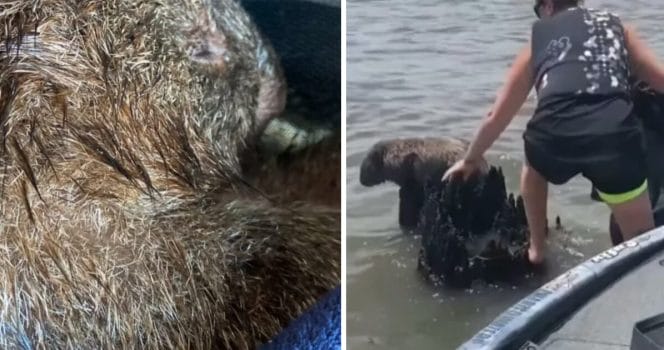 ”Som tur var så var vombaten redan så svag av det som hänt, så den kämpade inte emot, utan var glad att bli dragen ombord på båten”.