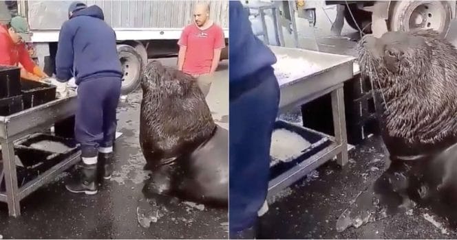 När fiskarna stod och rensade dagens skörd dök helt plötsligt en stor sjöhäst upp. Det stora sjölejonet var uppenbarligen så hungrig att han kunde göra vad som helst.