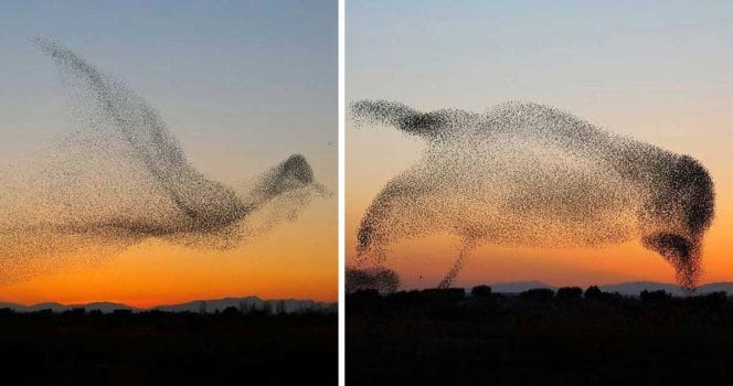 Fåglarna bildade ett stort moln tillsammans, och det var väldigt vackert mot den orangeröda solnedgången.