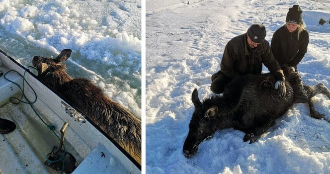 De kontaktade polisen, men eftersom de var långt ut visste de att tiden var knapp för den nedkylda älgkalven. De tänkte att de kunde ta sig ut med en båt, och försöka driva in älgen i land där isen hade spruckit.