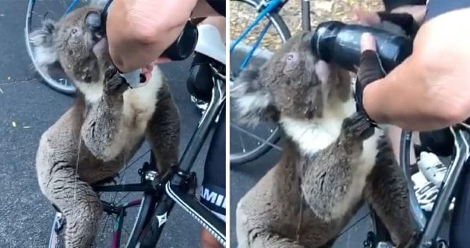 En koala springer fram till en cyklist – i desperat behov av vatten.