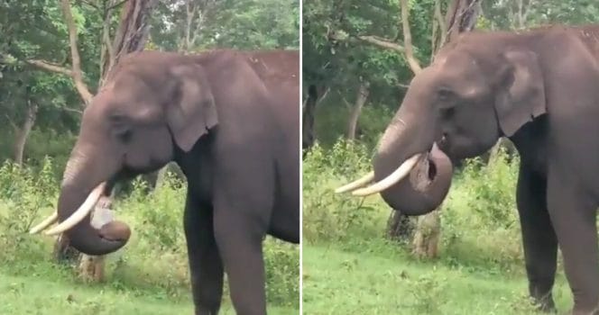 Elefanten lyfter upp plastpåsen – och tuggar i sig den