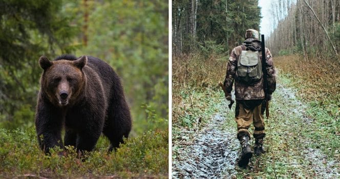 När en man jagade björn i skogen blev han själv attackerad av en björn som bet honom i huvudet.