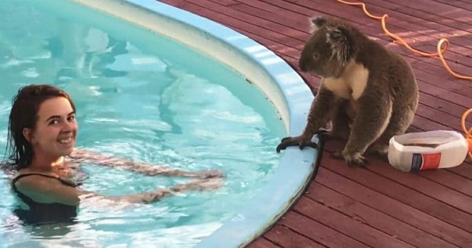 Koalan hade klättrat in på tomten och visade sig vara nyfiken – både på vattnet och människan däri.