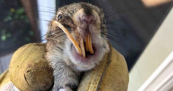 Titta bara på stackars liten! Jag kan knappt föreställa mig hur svårt det måste varit för den här ekorren att leva med dessa tänder. Tänk bara hur det är att äta med en sån jättetand som räcker hela vägen upp till ögat? Usch och fy. Stackars liten!