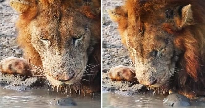 Vad som händer i klippet är att ett lejon dricker vatten i draget. Plötsligt kommer en liten sköldpadda simmandes in mot strandkanten. Lejonet får syn på sköldpaddan och reagerar på ett lite udda sätt. Se efter själv i filmklippet nedan. Reggi kallar sköldpaddans modiga reaktion för ”extremt ovanligt” att fångas på film.