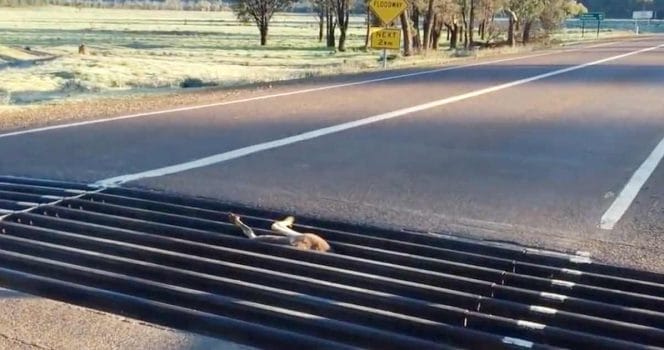 En man var ute och körde på en väg i Australien när han fick se något märkligt. Han skulle precis passera en så kallad cattle grate, ett slags galler på vägen som hindrar boskap från att passera där vägen korsar över en hage.