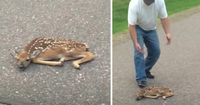 Djuret reagerade inte och därför bestämde han sig för att lyfta upp hjortkalven.