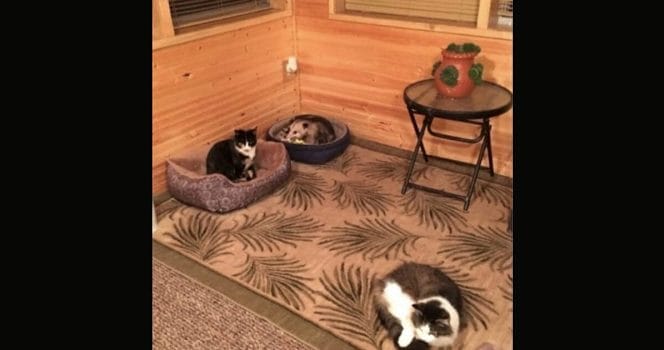 I en mysig liten kattsäng, omgiven av andra katter låg en pungråtta och njöt av värmen.
