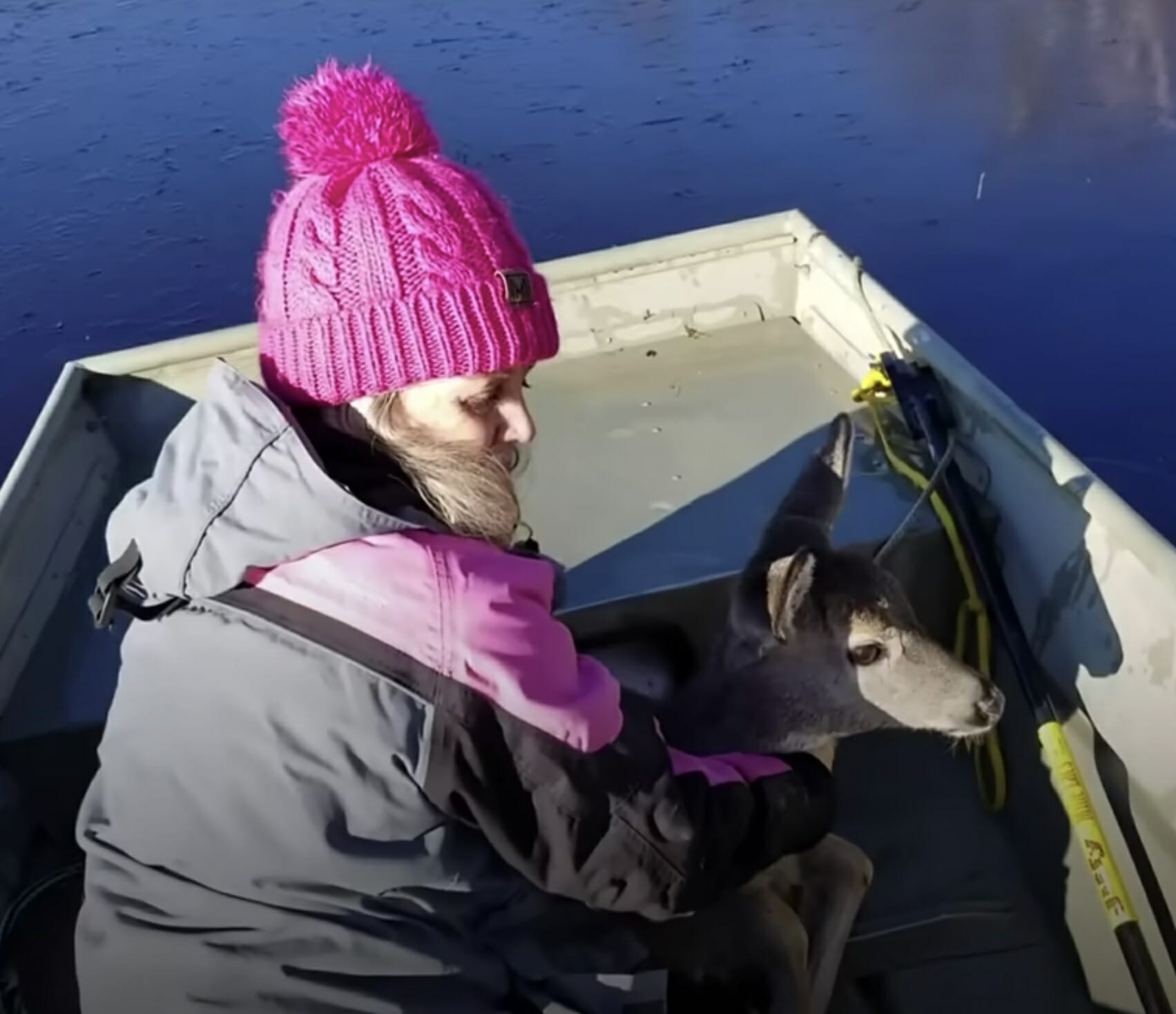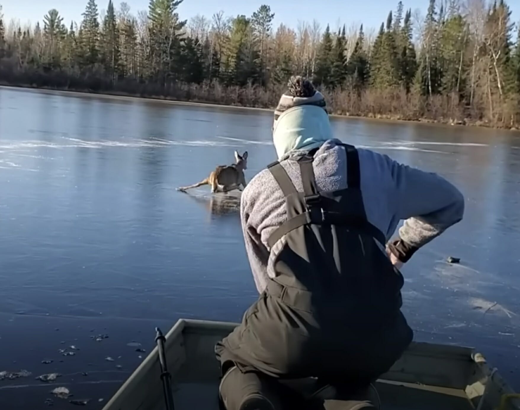 En dag när paret var ute till sjöss stötte de på ett rådjur på isen, visar ett klipp från the Dodo.