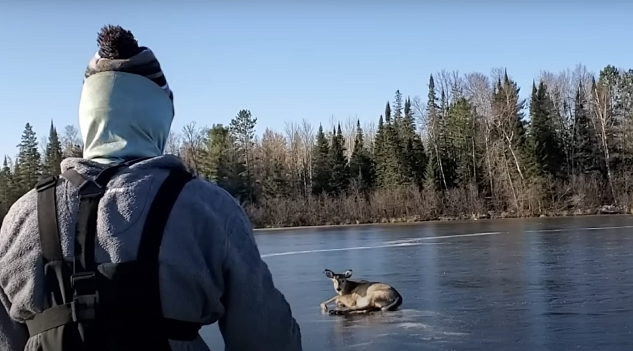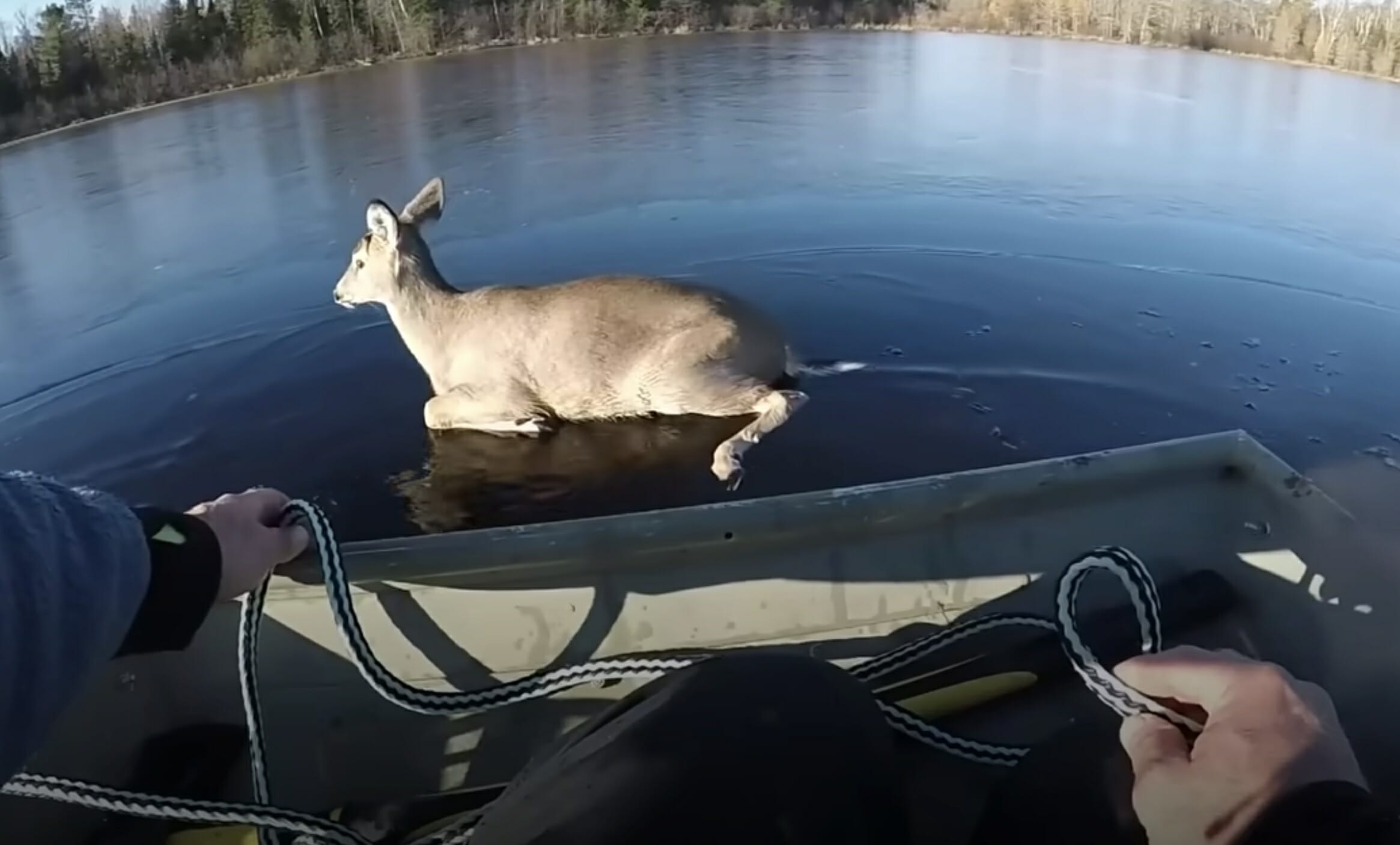 För ett rådjur i Wisconsin, USA, blev situationen allvarlig snabbt när hon råkade komma för långt ut på tunn is.