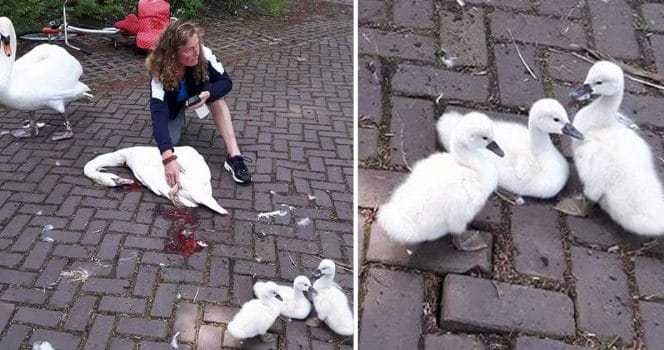 På bilden kan man se en svanmamma som blivit påkörd av en okänd man på en gata i Haag, Nederländerna. Med sig hade hon sina ungar och ungarnas pappa.