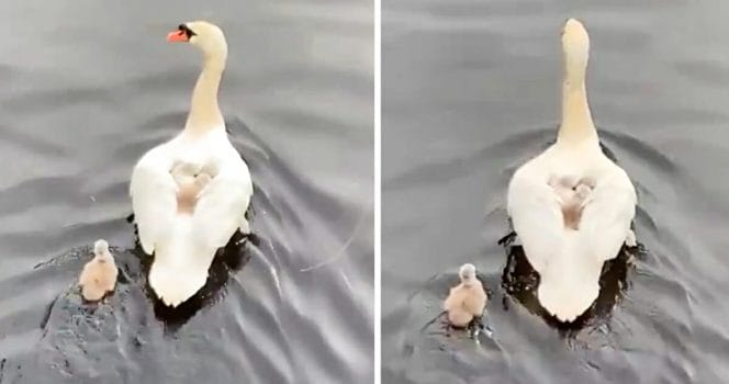 Videoklippet visar hur en svanpappa tar alla sina ungar över floden, efter att svanmamman gått bort.